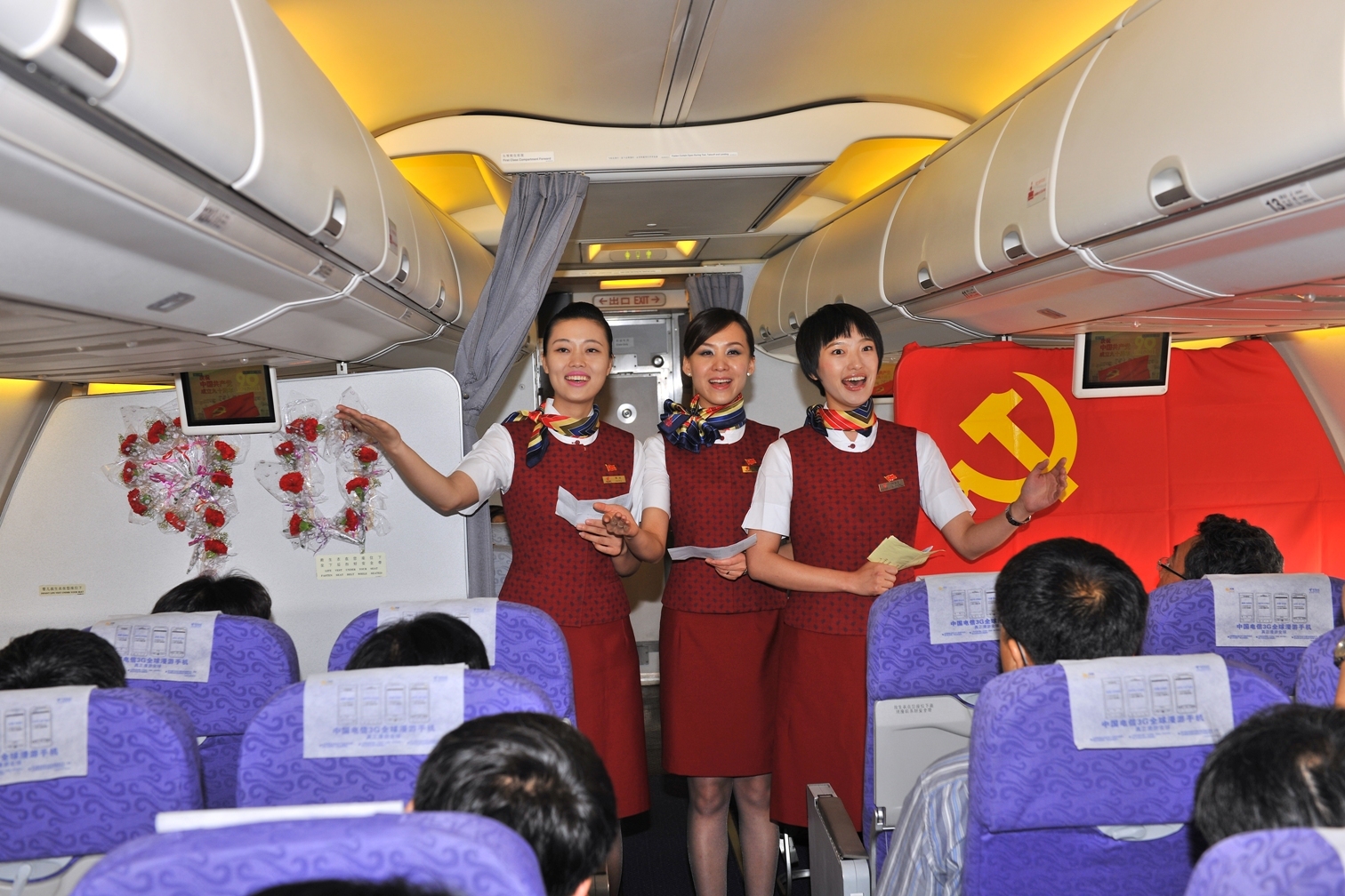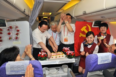 機上活動一開始,機長和乘務長就通過廣播向各位代表致以歡迎和敬意,表達了向先進黨員們學習的決心。致辭之后,乘務員們嘹亮的歌聲就回蕩在客艙的上空,一首首耳熟能詳的紅歌依次響起,飽含深情的《太陽最紅、毛主席最親》,悠揚婉轉的《春天的故事》,慷慨激昂的《走進新時代》,一首首紅歌引發了不同時代的記憶,而其中貫穿不變的是中國共產黨奮發向前、與時俱進的時代精神,紅歌勾起了黨員代表的深切共鳴,不斷引發出陣陣的掌聲。在《黨啊,親愛的媽媽》的抒情音樂中,乘務員們捧著托盤將鮮紅的黨徽帶入客艙,代表們集體佩戴上了珍貴的黨徽,與乘務員們共同合唱起氣勢雄渾的《沒有共產黨就沒有新中國》,在大合唱聲中,尋找90年來凝聚的激情、自豪和榮光。在歌聲中,乘務組推出了精心準備的蛋糕,蛋糕上裝飾著“熱烈慶祝中國共產黨成立90周年”的字樣,三位黨員代表共同切開了蛋糕,將現場氣氛推向了較高潮,乘務員將蛋糕分發到每一位代表的手中,用甜蜜的滋味共同來慶祝偉大的黨90華誕。《愛我中華》的歌聲中,國航乘務員們手持國航的司旗來到代表們身邊,代表們紛紛在司旗上簽了名,寫下了“慶祝黨90華誕”“祖國萬歲”“獻給黨的生日”等溫情寄語,客艙中滿溢著溫馨和諧的氛圍。
