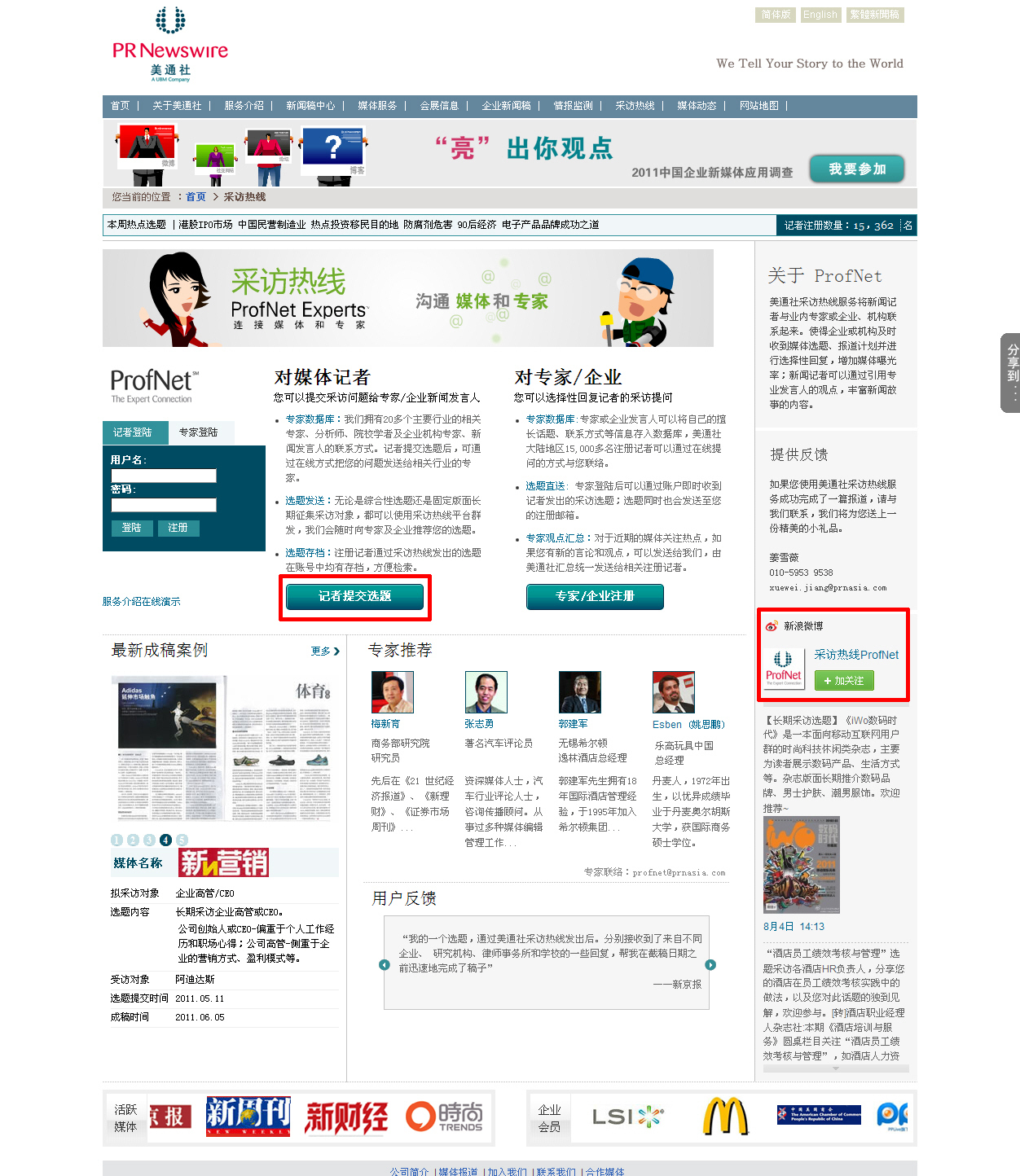 北京2011年8月26日電 /美通社亞洲/ -- 全球領先的企業新聞稿發布機構 -- 美通社今日宣布:享譽美國媒體公關界,提供媒體采訪信息的互動服務采訪熱線(ProfNet)新版平臺正式上線,所有媒體記者、企業新聞發言人及專家均可登錄 http://www.sjzhexin.cn/profnet/ 即刻體驗。