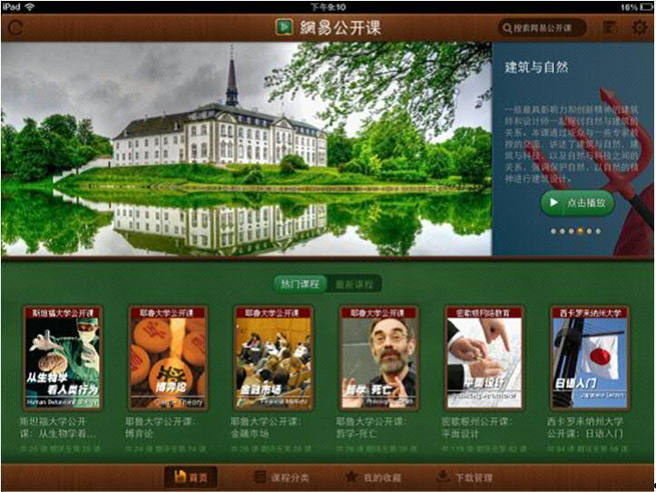 而網(wǎng)易公開課移動(dòng)客戶端,是網(wǎng)易專門為愛學(xué)習(xí)的網(wǎng)友打造的“隨時(shí)隨地上名校公開課”的免費(fèi)課程平臺(tái),它以哈佛、耶魯、牛津、劍橋等“全球名校視頻公開課”為內(nèi)容資源,結(jié)合穩(wěn)重的界面設(shè)計(jì)和人性化的操作,實(shí)現(xiàn)用戶與名校真正零距離接觸,無(wú)成本、無(wú)障礙地了解世界前沿的新知、新思。